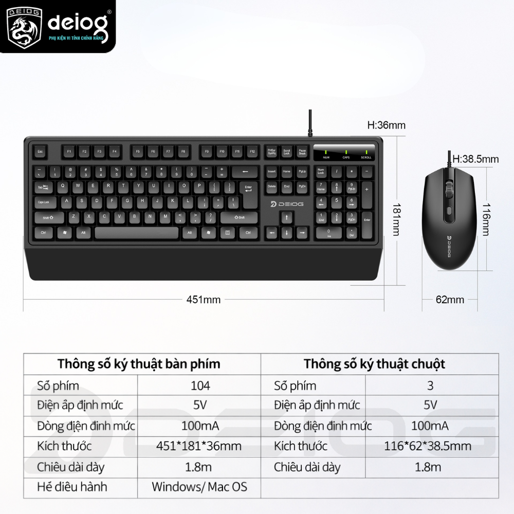 - Số phím/nút: 104 ( bàn phím) / 3 (chuột)