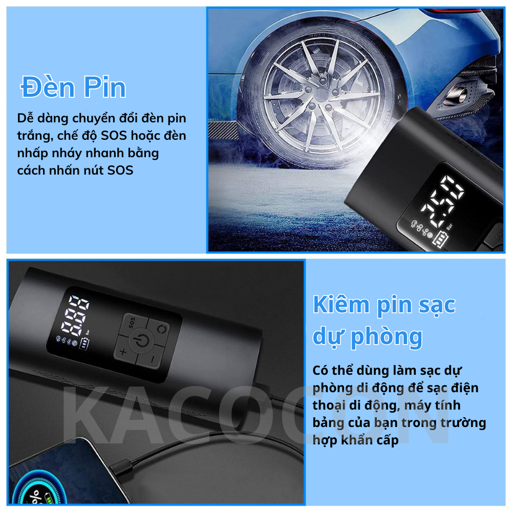 - Ngoài ra, bơm hơi điện có thêm 2 công dụng phụ: đèn pin chiếu sáng báo hiệu S.O.S và tích hợp pin dự phòng phù hợp cho những chuyến đi xa.